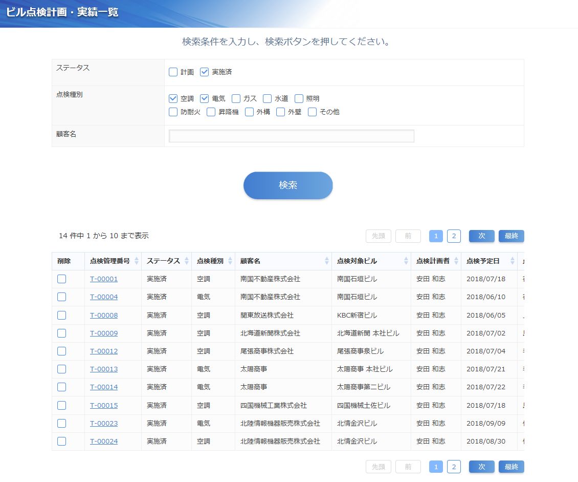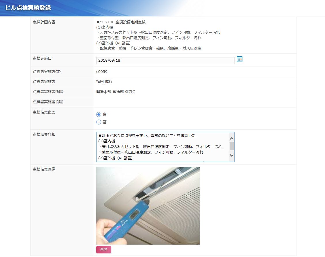 ビル各種設備の点検計画を立案し、これに対する実施結果を記録・管理できるアプリです。実施結果には、撮影した現場写真を添えて点検諸元データを登録することができます。