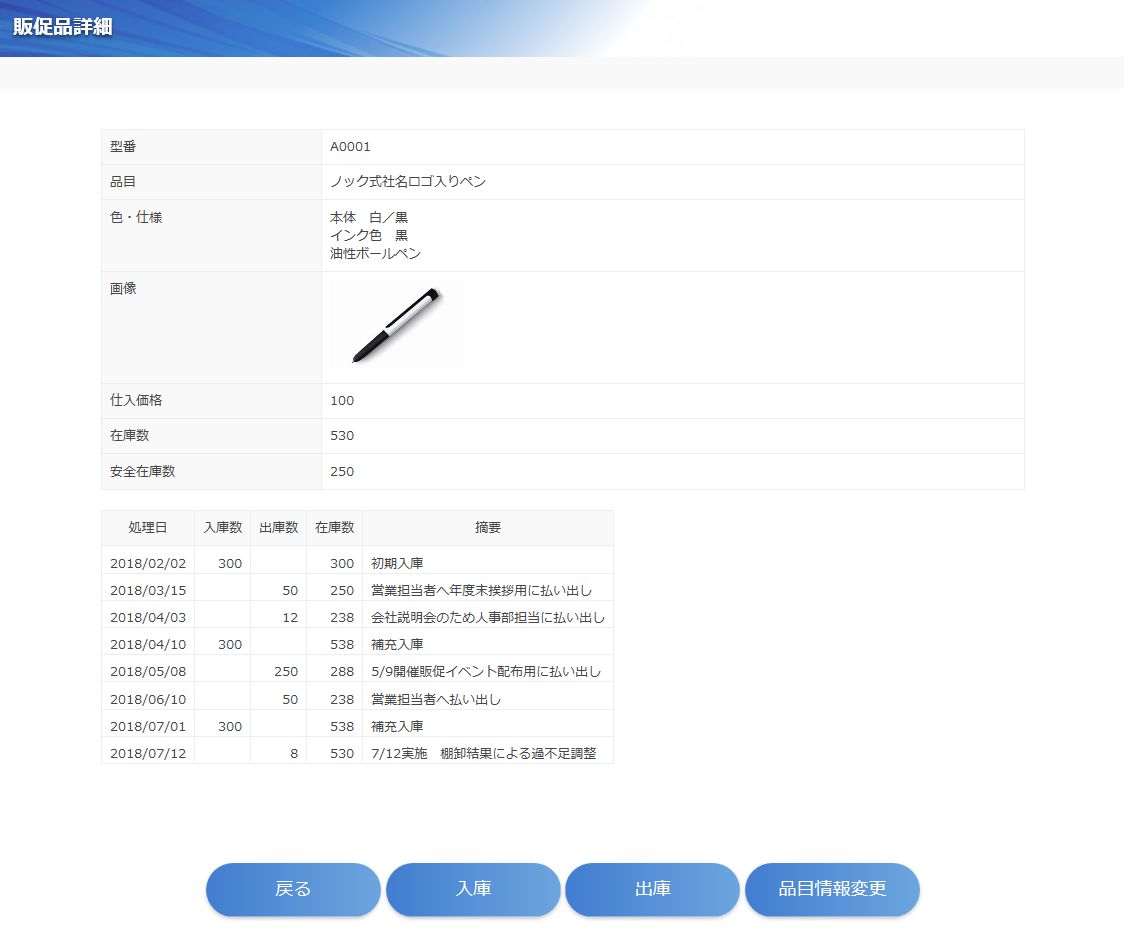 営業活動におけるセールスプロモーションのために配布する、ノベルティグッズ、製品カタログ、パンフレット、チラシなどの販促品の在庫管理を行うアプリです。