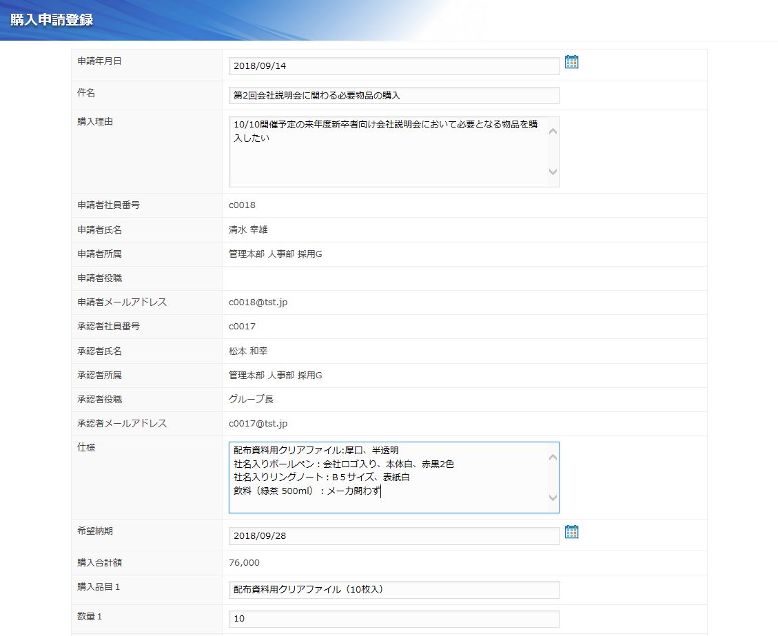 物品調達の一連の業務手順を、ワークフローとして処理することができるアプリです。