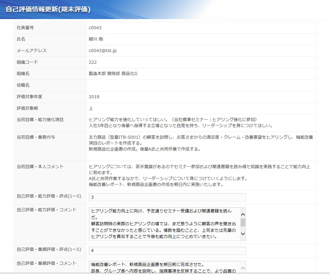 目標管理評価方式による人事評価プロセスの一連の業務手順を、ワークフローとして処理することができます。本人自己評価、上長評価、部門長評価のそれぞれの評価結果(評点、評価理由等)を、本人、上長、部門長の順に入力することが可能です。