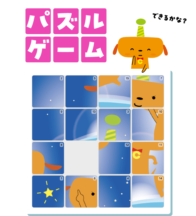 15枚に分かれたピースをクリックで動かし、バラバラになった画像を元の完成図に戻していきます。