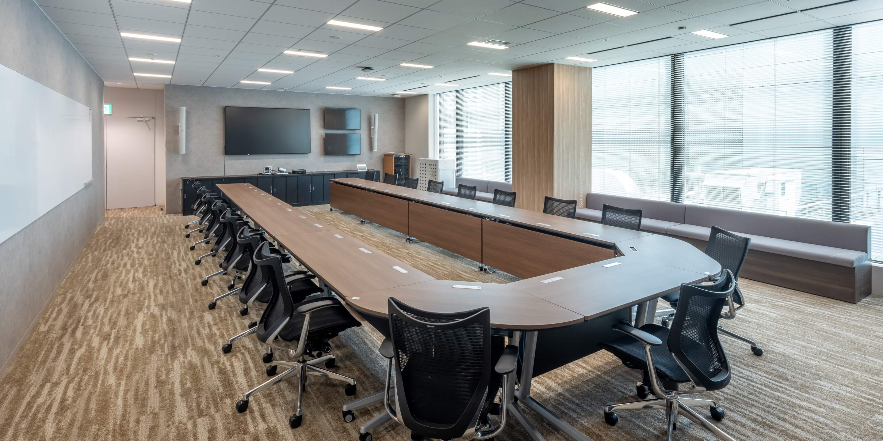 オフィスの玄関から、みんなの執務室に会議室、休憩スペースまで…座席が決められていないフリーアドレスなだけあって、オフィス内は変わった形の机が、変わった配置で並んでいるよ。