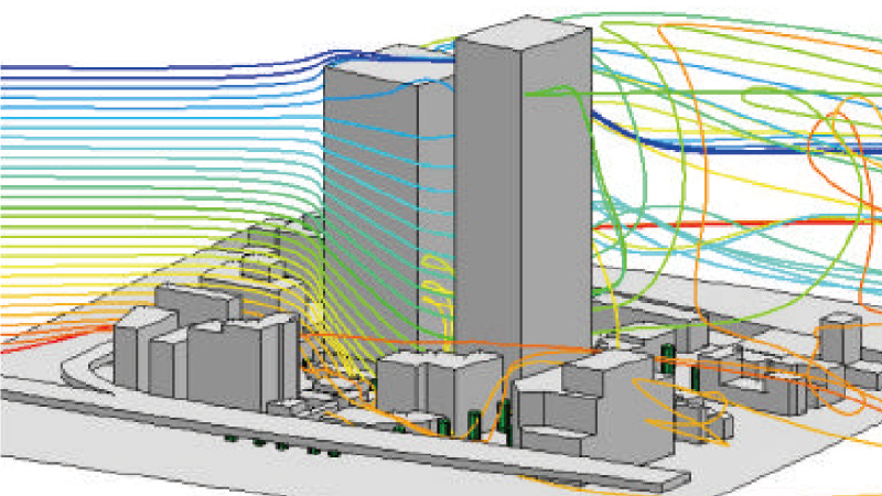 空気の流れを線で表示し、ビル風の影響を分かりやすく可視化します。さらに、温度分布なども画像として表示することで、現象を多角的に把握することが可能です。解析結果は経験豊富な技術者が専門的知見から解釈し、最適な構造設計や具体的な改善策をご提案します。