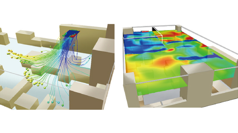 事業所の空調レイアウトは作業効率や消費電力に影響します。空気の流れだけではなく、温度分布もシミュレーションでき、色でわかりやすく可視化。効率的な空調レイアウトの検証を支援します。